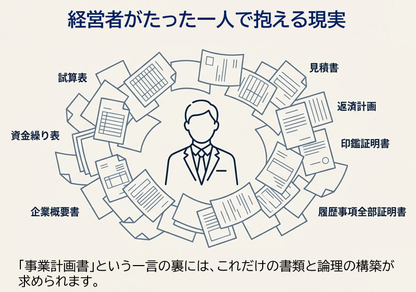日々の経営に忙殺される中で、銀行から求められる膨大な書類を揃え、それらを裏付ける論理を構築するのは、たった一人で抱えるにはあまりに重い現実です 。