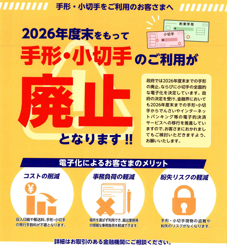 - 2026年4月1日:手形・小切手帳の新規発行受付が終了します 。
